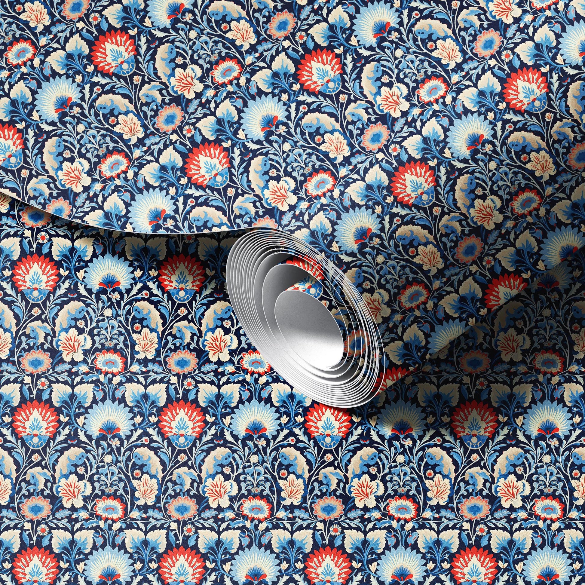 Art Deco Red and Blue Flowers Wallpaper
